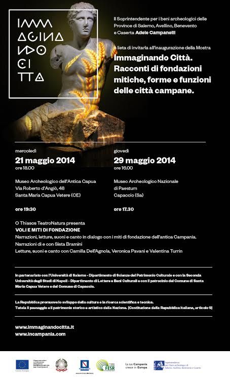 Giovedì 29 maggio 2014 presso il Museo Nazionale di Paestum si terrà l’Evento inaugurale della Mostra "Immaginando Città. Racconti di fondazioni mitiche, forma e funzioni delle città campane" organizzata dalla Soprintendenza per i Beni Archeologici di Salerno, Avellino, Benevento e Caserta nell'ambito dell'omonimo Progetto cofinanziato dalla Regione Campania con fondi POR FESR Campania 2007- 2013 a valere sull’Asse I Obiettivo Operativo 1.9.