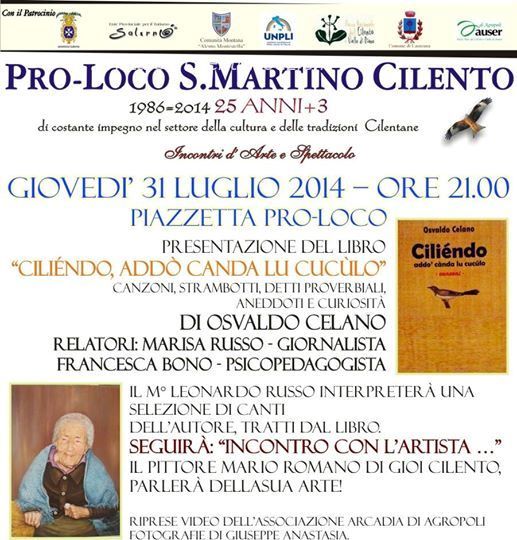 di Marisa Russo | BlogLa Pro Loco di San Martino Cilento, Presidente Angelo Niglio, chiuderà la programmazione di luglio con un vero inno al Cilento con la presentazione del testo “CILIE’NDO”_addò cànda lu cucùlo_ di Osvaldo Celano che sarà accompagnata da CANTI DELL’AUTORE INTERPRETATI DAL MAESTRO LEONARDO RUSSO. In conclusione il pittore cilentano Mario Romano parlerà e presenterà la sua Arte.