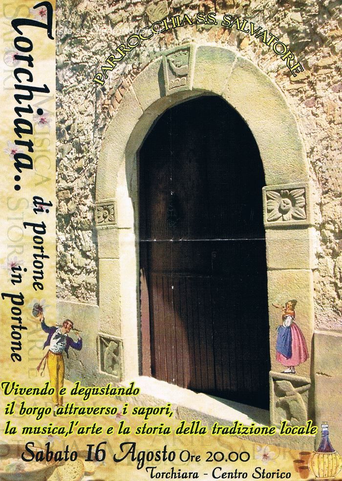 Un'atmosfera unica e imperdibile quella di questa serata! Si potranno gustare pizze fritte, pizze cilentane, acquasale, zuppa di ceci, dolci, frutta e vino: un tuffo nei sapori di una volta! Negli storici portoni del borgo, tutti riaperti per la serata, mostre fotografiche, poesie, storie di uomini del passato, botteghe artigiane, esposizioni di abiti antichi, di oggetti della vita di una volta, di prodotti tipici della nostra tradizione, balli, canti, luci e colori... A rendere unica l'atmosfera della serata la splendida musica dei Novartè.... e tanto altro ancora! NON MANCATE! Organizzato dalla Parrocchia SS.Salvatore di Torchiara...