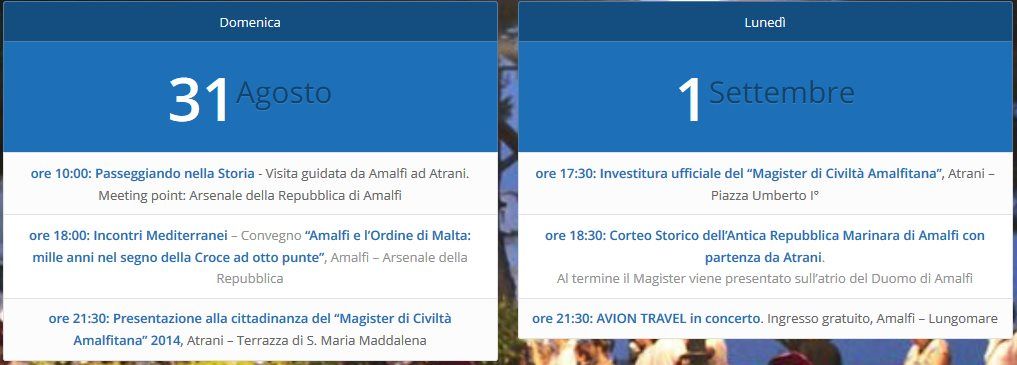Ci si appresta a celebrare dunque un’eccezionale edizione del Capodanno Bizantino organizzata dal Comune di Amalfi, in collaborazione con il Comune di Atrani, il Centro di Cultura e Storia Amalfitana e il Consorzio Amalfi di Qualità. L’evento vede quest’anno anche il cofinanziamento della Regione Campania e dell'Unione Europea nell’ambito del PO Fesr Campania 2007-2013 Ob. Op. 1.12. Si parte il 31 agosto alle 10 con un educational tour, una visita guidata da Amalfi ad Atrani che consentirà ai partecipanti di passeggiare e immergersi nella storia assistiti e informati da validi accompagnatori. All’Arsenale avrà luogo come da tradizione il convegno di studi che si svolgerà alle 18 alla presenza di autorevoli esperti e rappresentanti istituzionali. Il tema scelto per quest’edizione è “Amalfi e l’Ordine di Malta: mille anni nel segno della Croce ad otto punte”. Alle 21,30 l’appuntamento è ad Atrani. Sarà la terrazza di Santa Maria Maddalena ad ospitare la presentazione alla cittadina del Magister Civiltà Amalfitana con una speciale intervista. Appuntamento irrinunciabile il 1 settembre alle 17,30 in piazza Umberto I, nel cuore del caratteristico borgo di Atrani, con l’Investitura Ufficiale del Magister, alla presenza dell’Arcivescovo, dei due sindaci e dei rappresentanti istituzionali. Poi l’avvio del corteo storico alle 18:30 (in occasione del quale il transito sulla SS163 Amalfitana sarà interrotto) che sfilerà sul lungomare e verso la Cattedrale di Sant’Andrea dove il Magister sarà presentato alla città di Amalfi. Attesissimo il concerto degli Avion Travel che alle 21.30 si esibiranno dal palco allestito sul lungomare di Amalfi. Un imponente piano organizzativo è stato predisposto dalle due Amministrazioni comunali in collaborazione con le forze dell’ordine per garantire di evitare ingorghi durante la sfilata del corteo storico e per il concerto. L’invito per i tanti ospiti pendolari è di utilizzare le navette via mare che il 1 settembre partiranno dalle 20 da Salerno e che prevedono uno scalo a Minori alle 20.30 e il ritorno al termine del concerto.