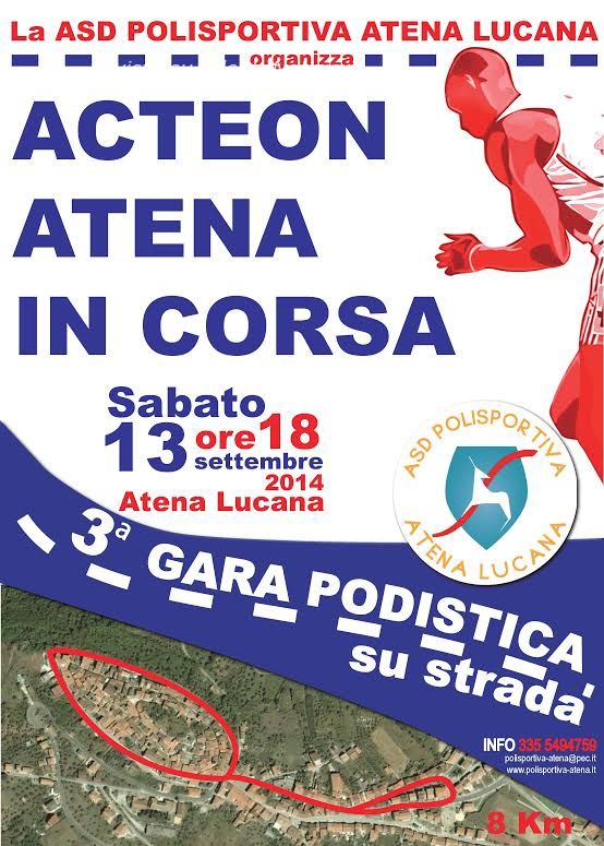 Riconfermarsi in un momento difficile per lo sport dilettantistico ed amatoriale del Salernitano. Con questo ambizioso obiettivo, l'A.S.D. Polisportiva Atena Lucana organizza per sabato 13 settembre p.v. (ore 18) la terza edizione di Acteon - Atena in corsa, competizione podistica su strada. Selettivo ed esigente, il percorso di gara - articolato in cinque tornate, ciascuna delle quali misurerà 1600 metri - esalterà le qualità di quei corridori che dispongano di un efficace cambio di ritmo, aspetto tecnico destinato a fare la differenza su un tracciato che, seppur relativamente breve, concederà agli atleti ben poche occasioni per respirare. Rispetto alla passata edizione, la fisionomia del circuito è rimasta sostanzialmente intatta: il primo segmento di corsa cingerà idealmente il centro storico del piccolo comune del Vallo di Diano. Al passaggio sul rettilineo opposto a quello d'arrivo seguirà l'ascesa di via Giuseppe Di Santi, agevole nel primo tratto, ripida nel finale. La discesa di viale Kennedy precorrerà all'ingresso degli atleti sul traguardo di via Roma.