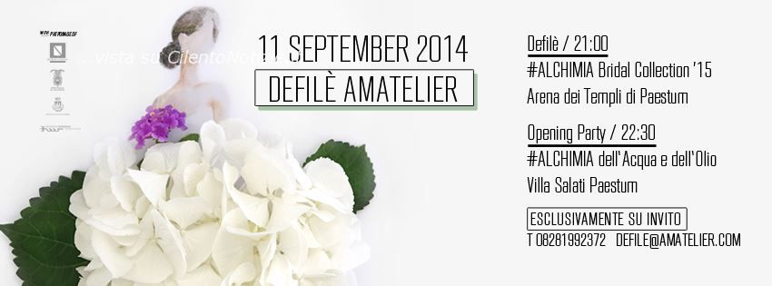 "Il matrimonio è cultura. Sono in migliaia, infatti, gli sposi che ogni anno scelgono Paestum, come location per il proprio evento –affermano gli ideatori del gruppo Amatelier. Altresì Paestum ce lo ricorda ogni giorno con i suoi templi, uno dei tre infatti possiede il nome della Dea “Hera”, protettrice della sacra unione. Sono queste le ragioni della scelta di individuare, nell’area archeologica dei Templi, la location ideale e suggestiva per presentare in anteprima nazionale, la preview collezione duemila quindici “Alchimia”, che vanta più di quaranta proposte sartoriali. L’innovazione dei tessuti unita al design concettuale e all’espressione dell’autentico Made in Italy, rappresentano i tratti distintivi del nostro progetto moda, che possiede anche un’anima green".