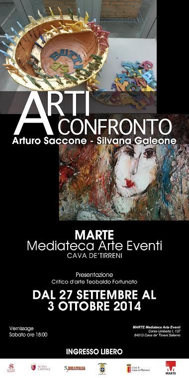 Il MARTE Mediateca Arte Eventi di Cava de’ Tirreni (Salerno), sabato 27 settembre 2014 ore 18.30 presenta le personali di Arturo Saccone e Silvana Galeone, una collettiva dal titolo “Arti a confronto”. La mostra si inserisce all’interno della rassegna “Percorsi d’arte” curata da Matilde Nardacci, in collaborazione con Arturo Saccone della Monart Gallery di Roma. La curatela artistica è di Teobaldo Fortunato.