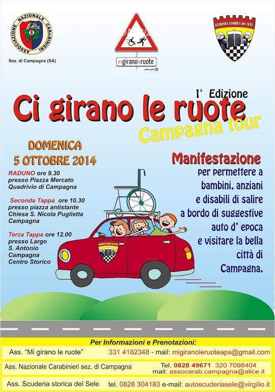 CAMPAGNA – Si terrà domenica 5 ottobre nel comune di Campagna, la prima edizione della manifestazione “Ci girano le ruote – Campagna Tour”. Tre le associazioni organizzatrici dell'evento sociale: “Mi girano le ruote”, l’Associazione Nazionale Carabinieri Sezione di Campagna e la Scuderia Storica del Sele. La manifestazione ha come obiettivo quello di animare i cittadini anche nella stagione autunnale attraverso un momento di aggregazione e di divertimento. In particolare si darà attenzione ai più piccini, gli anziani e ai disabili, categorie che purtroppo molto spesso, per svariati motivi vengono presi poco in considerazione. Ma l’invito a partecipare è rivolto anche ai tanti giovani ed adulti che hanno voglia di conoscere realtà diverse dalla routine quotidiana. Tutti i partecipanti potranno trascorrere una mattinata all'insegna della spensieratezza effettuando dei giri a bordo di suggestive macchine d'epoca e visitare la storica città salernitana. Il tour prevede tre tappe: ore 9.30 raduno in Piazza Mercato nella frazione Quadrivio; ore 10.30 nella Piazza antistante la Chiesa di San Nicola nella frazione di Puglietta; ore 12.00 Largo San Antonio nel Centro Storico di Campagna. La scelta di effettuare tre tappe è derivata proprio dalla volontà da parte degli organizzatori di andare incontro alle esigenze di tutta la popolazione dislocata sull’intero territorio così da permettere a chiunque di poter partecipare. Ai partecipanti saranno distribuiti dei gadget come ricordo della giornata. Una mattinata dunque all’insegna della solidarietà quella proposta da tre realtà associative che, seppur con caratteristiche e ruoli differenti, si uniscono nel comune intento di realizzare un qualcosa per dare sostegno e stimolo al divertimento ai cittadini. Per informazioni è possibile contattare Mi girano le ruote al 3314182348 – migiranoleruoteaps@gmail.com; Associazione Nazionale Carabinieri Sezione di Campagna allo 082849671 – 3207098404 – assocarab.campagna@alice.it; Scuderia Storica del Sele allo 0828304183 –autoscuderiasele@virgilio.it