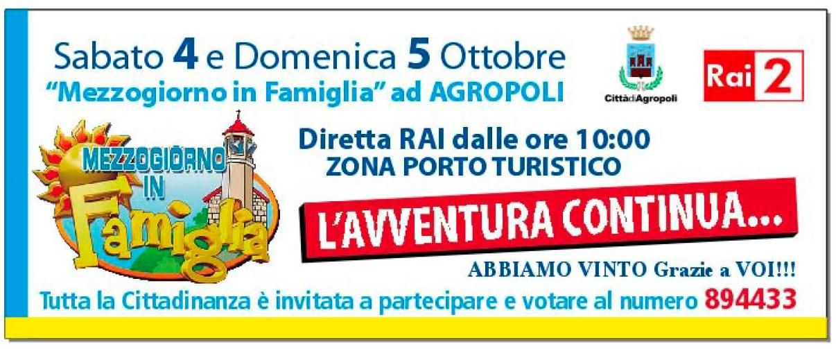 L'avventura continua...a Mezzogiorno in Famiglia. Sabato 4 e domenica 5 ottobre Agropoli sarà protagonista per la terza settimana consecutiva della trasmissione di RAI 2 condotta da Amadeus, Alessia Ventura e Sergio Friscia. Nel week end la squadra agropolese proverà nuovamente a superare il turno. Avversario il Comune di Gangi (Palermo).
