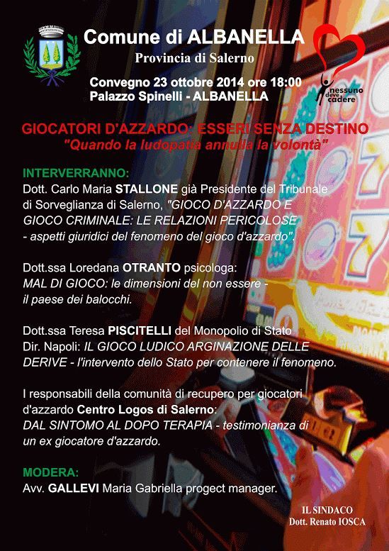 Albanella. Si terrà il giovedì 23 ottobre, alle 18.00, presso l’aula consiliare di Palazzo Spinelli, il convegno “Giocatori d’azzardo: esseri senza destino – Quando la ludopatia annulla la volontà”. Interverranno: Carlo Maria Stallone, già presidente del Tribunale di sorveglianza di Salerno per discutere di “Gioco d’azzardo e gioco criminale: le relazioni pericolose – Aspetti giuridici del fenomeno del gioco d’azzardo”; Loredana Otranto, psicologa, per parlare di “Mal di gioco: le dimensioni del non essere – Il paese dei balocchi”; Teresa Piscitelli, del Monopolio di Stato di Napoli, per discutere su “Il gioco ludico, arginazione delle derive – L’intervento dello Stato per contenere il fenomeno”; i responsabili della comunità di recupero per giocatori d’azzardo Centro Logos di Salerno per un intervento dal titolo “Dal sintomo al dopo terapia – Testimonianza di un ex giocatore d’azzardo”. Modera l’incontro l’avvocato Maria Gabriella Gallevi. L’evento è organizzato dal Comune di Albanella, retto dal sindaco Renato Iosca, e dall’associazione “Nessuno deve cadere”.