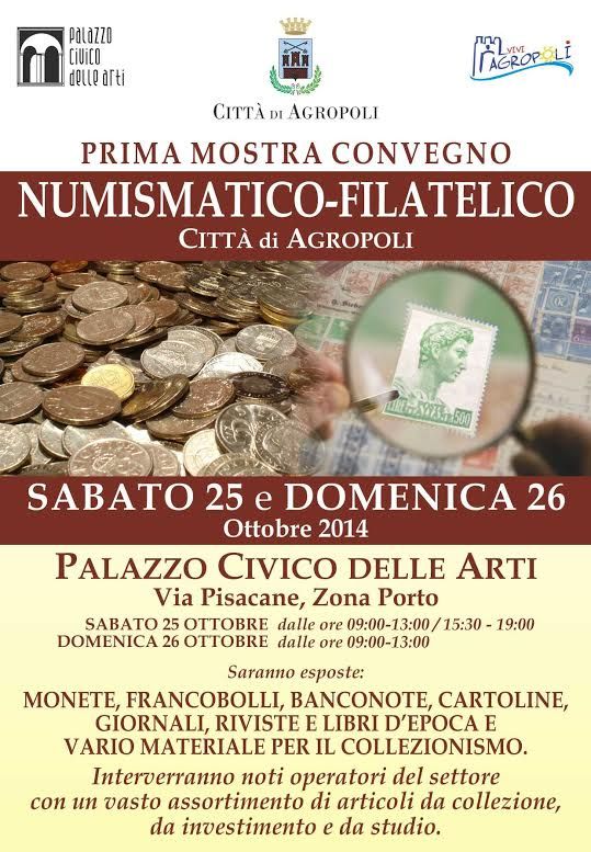 Il 25 e 26 ottobre le sale espositive del Palazzo Civico delle Arti di Agropoli ospiteranno la prima mostra-convegno filatelico numismatica "CittĂ di Agropoli".