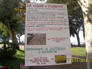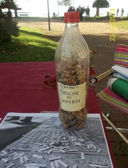 Sul banchetto di Fere verde è stato mostrato altresì una bottiglia sempre di plastica riempita di mozziconi di sigaretta raccolti in un giorno sulla spiaggia e per le vie di Sapri, a dimostrazione del grave problema dell’abbandono di questi oggetti che contengono diverse sostanze inquinanti degli ecosistemi naturali.