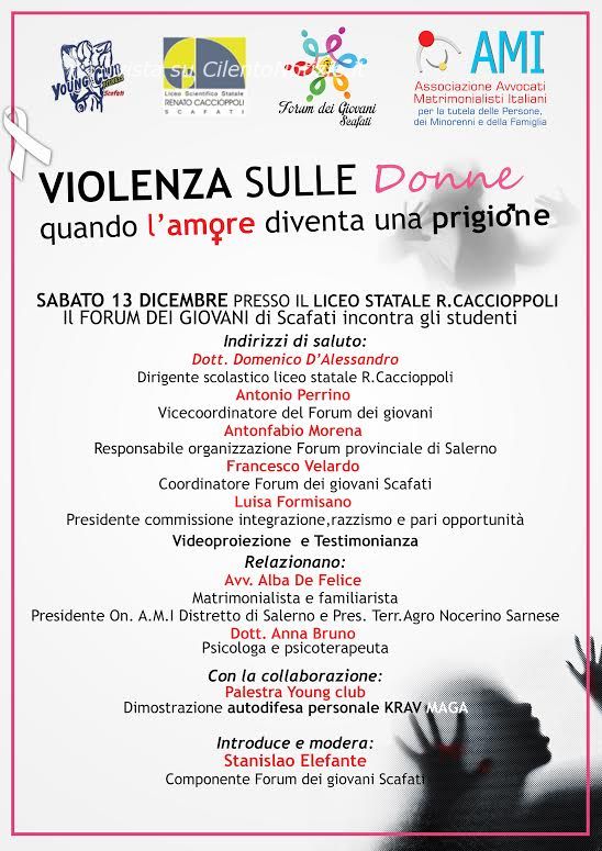 Sabato 13 Dicembre il Forum dei Giovani incontrerà gli alunni del Liceo S. Renato Caccioppoli. Verrà trattata una tematica molto importante e molto diffusa, la violenza sulle donne. Ci saranno esperti in materia che tratteranno nello specifico il tema, ovvero l'Avv. familiarista Alba de Felice e la Dott. Anna Bruno. Ci sarà una testimonianza diretta di una donna vittima di violenza da parte del suo ex compagno e per finire, con la collaborazione della palestra Young Club , ci sarà una dimostrazione di "KRAV MAGA", una tecnica di autodifesa personale importante in qualsiasi momento.