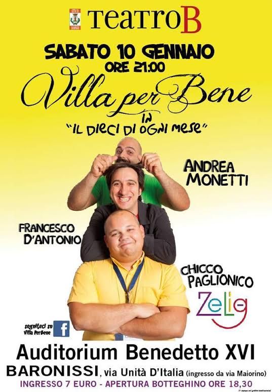 Se le feste sono finite, la voglia di divertirsi non passa mai. Torna lo spettacolo di Villa Per Bene. Il trio comico salernitano, composto da Chicco Paglionico, reduce dal successo di Zelig, Andrea Monetti e Francesco D’Antonio sarà in scena domani, 10 gennaio, all’ Auditorium Benedetto XVI a Baronissi. “Il dieci di ogni mese”…2.0 è lo spettacolo che proporranno al pubblico della Valle dell’Irno, attingendo da una matrice ormai consolidata, ma ricca di nuovi ed immancabili sketch comici. Un gruppo affiatato, sorprendente e folle che tutti i giorni condivide lo spazio casalingo oltre quello in scena e che progetta, vive e mette insieme aspetti di vita quotidiana che inevitabilmente danno spunto ad un cabaret arguto ed accattivante. Se Chicco, applauditissimo e tra i personaggi più amati a Zelig, riproporrà le sue disavventure da commesso Ikea, Andrea Monetti non mancherà di stupire con il suo repertorio e nuovi personaggi. A tenere le fila di tutto sarà Francesco D’Antonio, con riflessioni al vetriolo e la sua comicità colta. Tre sfaccettature dell’umorismo, tre modi diversi di affrontare il mondo della risata, tre menti, tre ragazzi che miscelano le proprie caratteristiche per uno spettacolo da lasciare senza fiato…per le troppe risate!