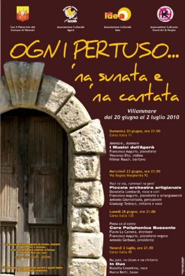 Dal 20 giugno al 2 luglio 2010, articolate in quattro serate a partire dalle ore 21.00, si svolgerà la rassegna Ogni pertuso ‘na sunata e ‘na cantata, percorso culturale, ideato da Francesco Augurio e Chiara Riva, che mira a valorizzare e far conoscere al pubblico alcuni dei portoni storici di Villammare.