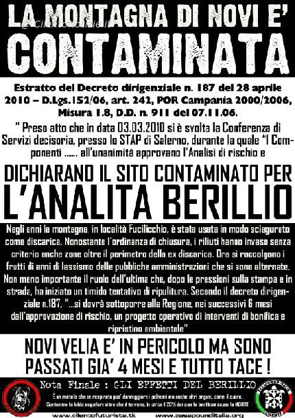 L'associazione culturale "Cilento Futurista - CasaPound Italia" continua la sua azione nel comune di Novi Velia. Dopo essere stata protagonista di varie denunce per salvaguardare il territorio, il gruppo ora torna sulla discarica di Fucilicchio. A gennaio , dopo varie pressioni, il comune ha iniziato un lento processo di pulizia. "Cilento Futurista" ora rende noto che in aprile è stato emesso il "decreto dirigenziale n.187" che dichiara "il sito contaminato per l'analita berillio". "Sono passati già quattro mesi dal suddetto Decreto e la cittadinanza non ne è stata messa al corrente. Abbiamo quindi - afferma Vittorio Rocco La Vecchia, responsabile di zona dell'associazione - deciso di fare le veci di coloro che credono di amministrare il paese e di coloro che si 'attivano' con una inesistente opposizione. Ieri abbiamo fatto volantinaggio in strada per Novi Velia, oggi usciamo con queste dichirazioni. Il comune latita e il piano di risanamento e bonifica ancora è in alto mare. Il berillio - conclude La Vecchia - è un metallo che se respirato puo’ danneggiare i polmoni ma anche altri organi, come il cuore. Contamina le falde acquifere oltre che il terreno. In circa il 20% dei casi la berilliosi causa la morte. L’omertà può nuocere gravemente alla salute".