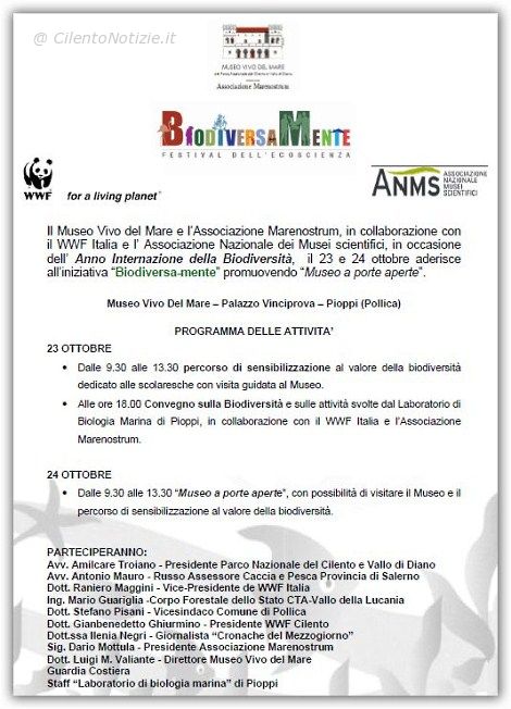 Il Museo Vivo del Mare di Pioppi (Palazzo Vinciprova) ospiterà nei giorni 23 e 24 ottobre i lavori di una conferenza sulla Biodiversità. L’iniziativa, denominata “Biodiversamente”, rientra nei programmi delle manifestazioni dedicate all’Anno Internazionale della Biodiversità indetto dall’ONU. Ne sono promotori Luigi Valiante, Direttore del Museo, Giacomo Giacobini, Presidente dell’Associazione Nazionale Musei Scientifici e Stefano Leoni, Presidente del WWF Italia. Per le ore 18.00 del 23 è programmata la Conferenza a cura dell’Associazione Marenostrum e del WWF. Nel corso delle due giornate sono previste visite gratuite all’acquario, mostre fotografiche sulla biodiversità e sulle attività svolte dal Laboratorio di Biologia Marina di Pioppi, che riguardano ricerche sulla tassonomia, la biogeografia e l’ecologia delle specie viventi nell’Area marina “La Punta”.