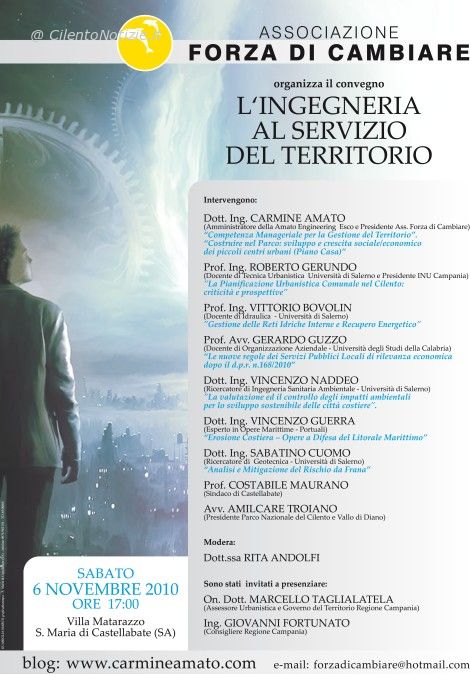 Il Convegno, vuole marcare l’importanza di avere figure Manageriali con competenze Ingegneristiche nella Gestione di un Territorio, e vedrà intervenire illustri esponenti dell’ Università di Salerno come il Prof. Ing. Roberto Gerundo ( Docente di Tecnica Urbanistica e Presidente INU Campania), il Prof. Ing. Vittorio Bovolin (Docente di idraulica), il dott. ing. Vincenzo Naddeo ( Ricercatore Ingegneria Sanitaria Ambientale), il dott. ing. Sabatino Cuomo ( Ricercatore Geotecnica), ma anche esperti liberi professionisti come il dott. ing. Vincenzo Guerra (Esperto in Opere Marittime - Portuali), tutti membri dell’”Associazione Forza di Cambiare”. Sono stati invitati a presenziare anche l’On. Prof. Ing. Edoardo Cosenza (Assessore Opere e Lavori Pubblici Regione Campania), l’Avv. Marcello Feola ( Assessore Lavori Pubblici, Urbanistica, PTC Provincia di Salerno), il prof. Costabile Maurano ( Sindaco di Castellabate), l’Avv. Amilcare Troiano ( Presidente Parco Nazionale del Cilento e Vallo di Diano), modera la dott.ssa Rita Andolfi. L’Associazione Forza di Cambiare ha sede in Castellabate (Sa) fraz. Santa Maria via Lungomare Pepi ( presso il Palazzo Amato), è anche sede zonale del Patronato ENASCO e presta assistenza Amministrativa (sig. Vincenzo Di Napoli) e Legale ( Avv. Angelica Amato e Avv. Bruno Piccolo) gratuita per assistere e tutelare i lavoratori del Commercio, del Turismo e dei Servizi nell’ottenimento di prestazioni pensionistiche e di carattere sociale in genere. Per informazioni e contatti: Email: forzadicambiare@hotmail.com Blog: www.carmineamato.com