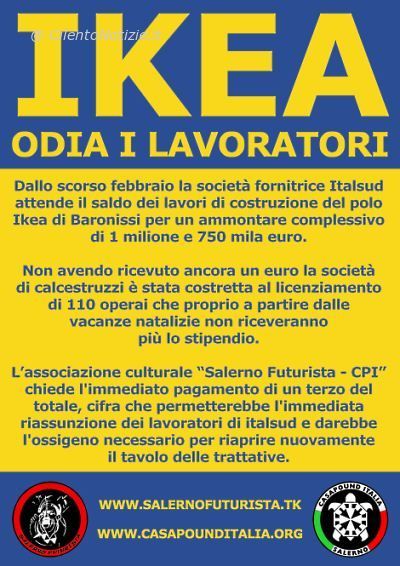 Nella notte i militanti dell'associazione culturale e di promozione sociale Salerno Futurista-CasaPound Italia hanno sigillato l'ingresso dello stabile Ikea di Baronissi con del nastro bianco e rosso e affisso striscioni recanti lo slogan "Ikea odia i lavoratori".