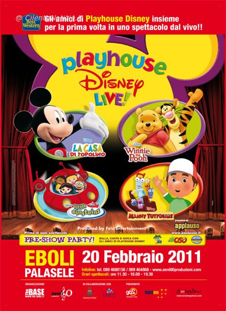 INFO UTILI Le prevendite per la tappa di Eboli del “Playhouse Disney Live!”sono già attive. Una matinee e due repliche pomeridiane per lo show: 11.30, 16.00 e 19.30. I costi vanno dai 27.50 euro per la gradinata ai 49.50 euro per la poltrona gold. Per informazioni: 089 4688156, www.anni60produzioni.com.