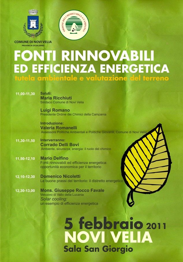 Tra i temi affrontati, gli sbocchi professionali per i chimici nell'ambito dei settori dell'ambiente e dell'energia, le opportunitĂ derivanti da un impiego delle fonti rinnovabili in piena armonia con il territorio e, finalmente, un case study relativo all'installazione di un innovativo impianto di solar cooling, presentato dal Vescovo di Vallo della Lucania.