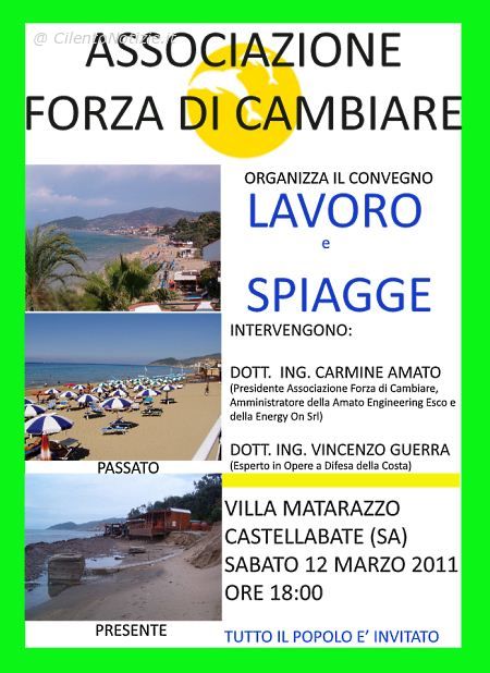L'associazione Forza di Cambiare con sede in S.Maria di Castellabate terrà un convegno dal titolo “Lavoro e Spiagge”, il Presidente ing. Carmine Amato ci informa sull'interessante tema che verrà trattato il 12 Marzo in Villa Matarazzo a Castellabate.