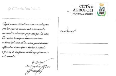 E’ il messaggio che il sindaco di Agropoli, Franco Alfieri, “invierà” simbolicamente a tutti i nuovi nati della città, attraverso una cartolina di benvenuto che sarà consegnata ai genitori dai dipendenti dell’Ufficio dello Stato Civile. La prima cartolina è stata “inviata” questa mattina ad Alice, nata ieri presso la Clinica Malzoni.