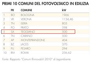 Il Comune di Teggiano risulta essere fra i primi dieci comuni italiani, precisamente il quinto, con la maggiore potenza di pannelli fotovoltaici installata in edilizia. Sugli edifici nel territorio del comune di Teggiano sono stati installati pannelli fotovoltaici per produrre energia elettrica pari a 500 kw. Il nostro comune è preceduto da Prato, Isera, Verona e Bologna, al primo posto, con una potenza di quasi 2mila kw installata. Roma è al decimo posto. I dati scaturiscono dal rapporto di Legambiente “Comuni Rinnovabili 2010”, attraverso un questionario a cui hanno risposto circa 600 amministrazioni comunali, 156 in più rispetto al 2009. Sono 76 i Comuni che hanno introdotto, secondo quanto previsto dalla Finanziaria 2008, all’interno del proprio Regolamento Edilizio l’obbligo di installazione di pannelli solari fotovoltaici per almeno 1 kW ad alloggio nella nuova edificazione.