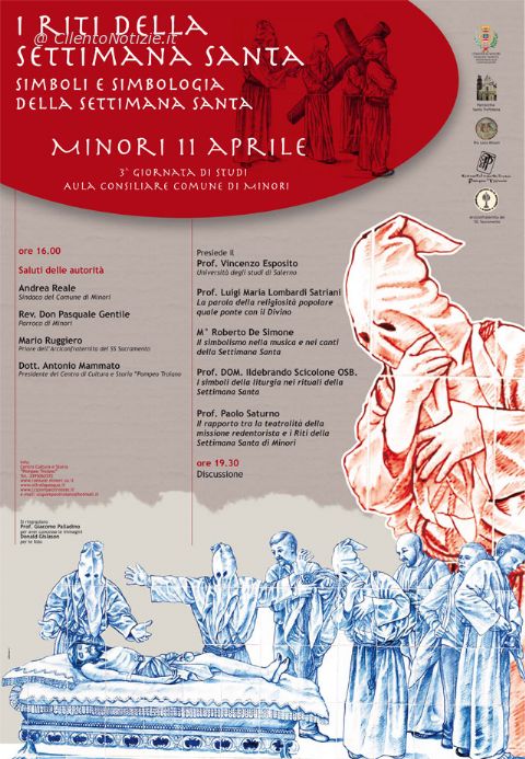 Lunedì 11 Aprile, presso l’Aula Consiliare del Comune di Minori, a partire dalle ore 16.00, si terrà la III Giornata di Studi dal titolo “I Riti della Settimana Santa. Simboli e simbologia della Settimana Santa”. L’evento, organizzato dal Centro di Cultura e Storia “Pompeo Troiano” di Minori, ha come obbiettivo principale la promozione degli studi e delle ricerche su rituali di particolare suggestione, che da secoli si ripetono durante i giorni in cui si commemora la Passione di Cristo.