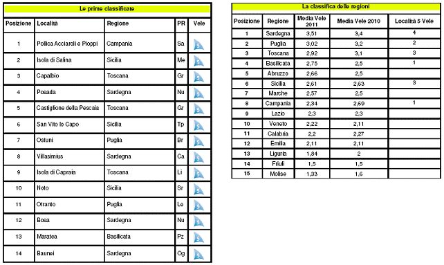 A livello regionale, dopo Pollica, il podio viene completato dalle tre vele conquistate da Centola-Palinuro e da Positano, che scalza dal terzo gradino il comune di Pisciotta. Il paese di Angelo Vassallo, il sindaco ambientalista ucciso nel settembre dello scorso anno, rappresenta una vera eccellenza della regione, esempio virtuoso di come sia possibile fare economia e al tempo stesso salvaguardare le risorse naturali e paesaggistiche anche in un territorio difficile. Grazie all'impegno di Vassallo, infatti, Pollica, con le localitĂ costiere di Acciaroli e Pioppi, è diventata un punto di riferimento per il sistema di raccolta differenziata e per lo sviluppo e l'integrazione delle fonti rinnovabili in Campania ed è stata scelta anche come sede dell'Osservatorio permanente della Dieta Mediterranea, riconosciuta qualche mese fa dall'Unesco come Patrimonio Immateriale dell'UmanitĂ grazie proprio agli sforzi del sindaco Vassallo.
