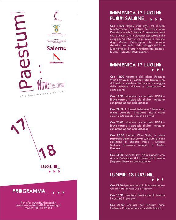 E’ prevista la registrazione di Wine Bar con Giuseppe Maria Galliano con ospiti di eccellenza. In serata altra importante sfilata di alta moda di Stefania Asole, stilista di fama internazionale. A seguire musica ed intrattenimento. Lunedì sarà possibile visitare il salone dalle 15.30 sempre con le degustazione e con tante sorprese. Ringrazio il Consorzio Albergatori per la grande disponibilità nei confronti di questo festival e Luciano Gorrera di Hera Catering, da sempre al nostro fianco. E’ possibile accreditarsi per l’ingresso inviando un’email a paestumwinefestival@diviniassaggi.it”.
