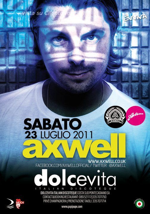 Il Dolcevita, ora, si prepara ad accogliere Axwell, il dj e produttore discografico di origine svedese. E’ un componente degli Swedish House Mafia assieme a Sebastian Ingrosso e Steve Angello. La sua botta di successo, che l’ ha fatto conoscere al grande pubblico internazionale è stata Feel the vibe, nel 2004, poi Together nel 2005, realizzata assieme al grande amico e collaboratore Sebastian Ingrosso, a seguire Watch the Sunrise, cantata da Steve Edwards (ha raggiunto la posizione n.3 nella Radio 1 Club Chart), e poi ancora il successo continua con Tell me why realizzata con Steve Angello.