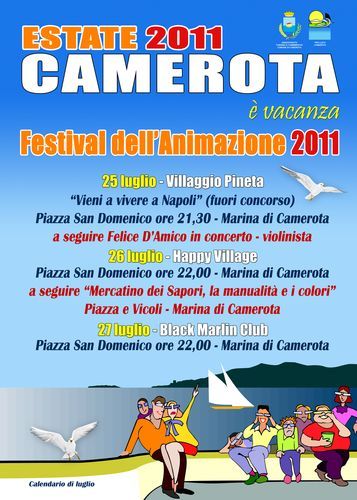 Vi partecipano animatori dei diversi villaggi turistici presenti nella zona. Si concluderà con l’assegnazione del titolo “Camerota e Vacanze” al miglior gruppo di animazione. Per gli appuntamenti musicali, sulla Terrazza Simon Bolivar a Marina di Camerota, si alternano Espedito De Marino per la canzone classica napoletana ed il gruppo Mare Forza 7 per i favolosi anni ’60 e ’70.
