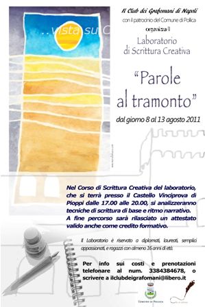 Il Comune di Pollica/Acciaroli, in collaborazione con il Club dei Grafomani di Napoli, organizza dall’8 al 13 agosto 2011, il laboratorio di Scrittura Creativa “Parole al Tramonto”.