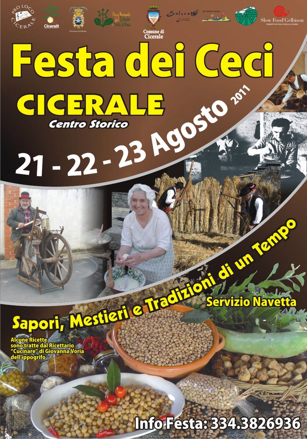 Sapori, mestieri e tradizioni di un tempo alla “Festa dei ceci” che si svolgerà nel borgo di Cicerale dal 21 al 23 agosto. Protagonista indiscusso dell’evento enogastronomico sarà il celeberrimo cece di Cicerale, dall’antichissima coltivazione e dalle note qualità organolettiche. La degustazione di piatti tipici avverrà nel centro storico e nel Palazzo Marchesale di Cicerale. Inaugurazione domenica 21 agosto alle ore 19 alla presenza del vice presidente della giunta regionale della Campania e assessore al turismo, Giuseppe De Mita, del consigliere regionale Luigi Cobellis e del sindaco Francesco Carpinelli.