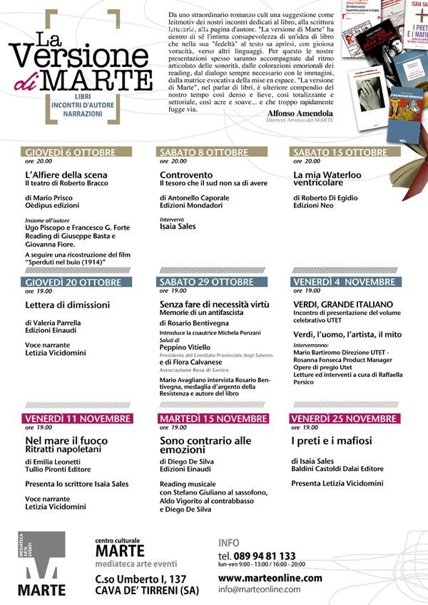 Nuovo appuntamento con il caffè letterario “La Versione di MARTE” al MARTE Mediateca di Cava de’ Tirreni (Sa). Sabato 29 ottobre, alle ore 19.00, accompagnato da Michela Ponzani, Rosario Bentivegna presenterà “Senza fare di necessità virtù. Memorie di un antifascista”, il testo autobiografico che ripercorre i momenti più importanti della sua vita e della Resistenza italiana: dall’adesione al PCI ai fatti di via Rasella a Roma, fino all’uscita dal Partito Comunista. Domani, intanto, l’ultima tappa del mese di ottobre de “Lo splendore audiovisivo. Suoni, visioni narrazioni”. Alle ore 18.00 seminario su “Videomapping: archeologia, linguaggi, applicazioni”, a seguire l’audiomusical liveset di Hypoikòn