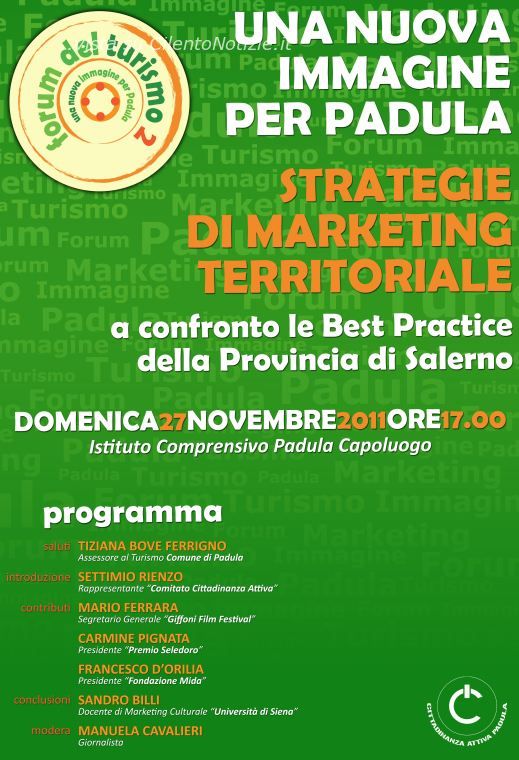 Il Comitato Cittadinanza Attiva Padula, dopo aver proposto nell’ottobre 2010 la creazione di un Forum permanente del Turismo quale strumento per la pianificazione turistica sostenibile e partecipata, fondamentale per la rinascita del turismo locale, a distanza di un anno propone un incontro per rilanciare il dibattito sul turismo, durante il quale saranno presentati i progetti portati a termine durante il primo anno di attività del Forum.