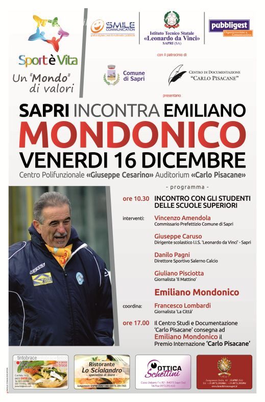 La città di Sapri ospita Emiliano Mondonico: venerdì mattina 16 dicembre, alle ore 10.30 presso l’Auditorium “Carlo Pisacane” l’ex allenatore di Atalanta, Torino, Napoli, Fiorentina e Albinoleffe incontrerà gli studenti delle Scuole Superiori della città della spigolatrice, per discutere con loro del tema “Sport è Vita”.