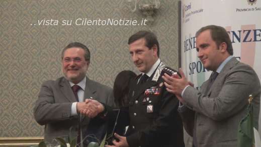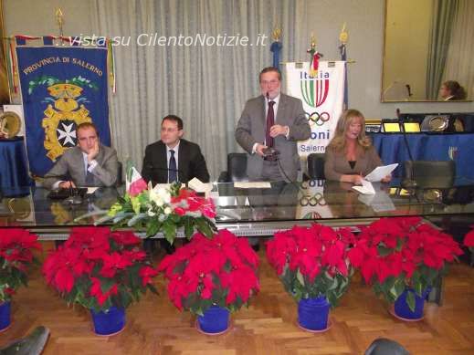 La Provincia di Salerno ed il Comitato Provinciale del CONI, nel corso di una cerimonia a Palazzo Sant’Agostino, hanno consegnate le Benemerenze Sportive Provinciali ad atleti, tecnici, dirigenti, società sportive, ufficiali di gara, enti di promozione, enti e cittadini, che si sono contraddistinti per impegno e risultati in ambito sportivo. Il presidente della Provincia on. Edmondo Cirielli, il presidente del CONI Salerno Guglielmo Talento e l’assessore allo Sport Antonio Iannone hanno conferito il premio “Amico dello Sport” e Premio d’Onore al Questore di Salerno Antonio De Iesu. Premi d’onore sono stati conferiti a: s.e. Rev.ma Mons. Luigi Moretti, al presidente della Provincia Edmondo Cirielli, al vice prefetto vicario di Salerno Giovanni Cirillo, al presidente Corte d’appello Matteo Csale, al procuratore generale della repubblica Lucio Di Pietro, al presidente del Tribunale di Salerno Ettore Ferrara, al procuratore capo di Salerno Franco Roberti, al comandante provinciale Guardia di Finanza Salvatore De Benedetto, al comandante provinciale dei Carabinieri Fabrizio Parrulli, al comandante capitaneria di porto Andrea Agostinelli, al capo centro Esercito Italiano Salerno Flavio Rizzo, al comandante Rgt 19 Cavalleggeri Guide Francesco D’Ianni, al presidente Autorità portuale Andrea Annunziata, al comandante provinciale VV.F Paolo Moccia. Targhe d’oro alla memoria sono state consegnate ai familiari dell’artista Ugo Marano e Michele Petrone. Premi agli atleti dell’anno: Antonietta Di Martino e Giampiero Pastore. Nella categoria Benemerenze ai cittadini, sono stati premiati, tra gli altri, con un distintivo d’oro, il presidente del Parco Nazionale del Cilento e Vallo di Diano Amilcare Troiano e Daniele Filizola. Tra gli enti, premiato, tra gli altri, Ugo Picarelli della Leader.